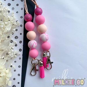Our 'Aria’ lanyard features a range of 19mm & 15mm silicone and acrylic beads, on a Pink or White cord (subject to availiability), with a Silver 38mm Swivel Clasp.