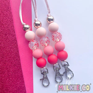 Our 'Lettie’ lanyard features a range of 19mm & 15mm silicone and acrylic beads, on a pink or white (subject to availability) cord, with a Silver Lobster Clasp.