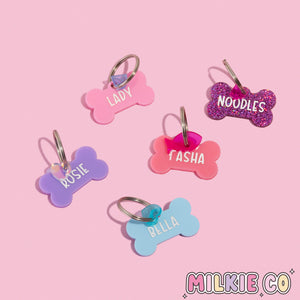 Get ready to flaunt your furry friend's adorable personality with our sweet dog bone shaped acrylic tag! Crafted with love and adorned with your pet's name in charming, hand-drawn script, this tag is a paw-some way to show off their unique charm.