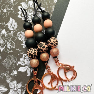 Our 'Brylie’ keyring features a range of 19mm & 15mm silicone & acrylic beads, on a rose gold clasp lobster clasp and is also available in matching Car Diffuser and Lanyard.