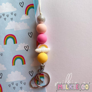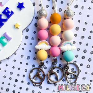 Our 'Rainbow lanyard' features a range of 15mm-19mm silicone and acrylic beads, on a White cord with a Silver Lobster Clasp.