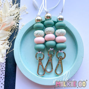 Our 'Sage’ lanyard features a range of 15mm-22mm silicone and acrylic beads, on a White cord with a Silver Premium Snap Hook.