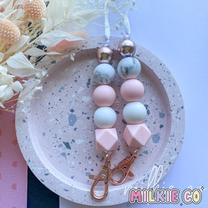Our 'Taryn’ keyring features a range of 19mm, 17mm & 15mm silicone & acrylic beads, on a Rose Gold 38mm Swivel Clasp.