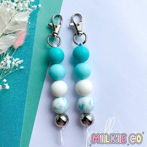 Our 'Teale’ keyring features a range of 19mm & 15mm silicone & acrylic beads, on a Silver 38mm Swivel Clasp.