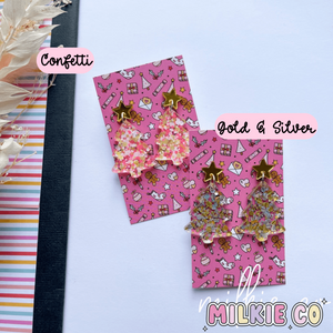 Created from laser cut sparkly glitter acrylic and attached with surgical grade stainless steel studs.
