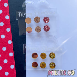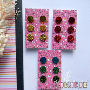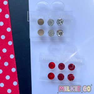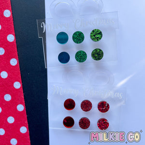 Size: 3 x 15mm stud sets on a FREE Limited Edition Acrylic "Merry Christmas" Earring Holder.