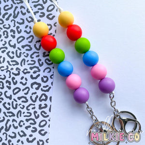 Our 'Rainbow’ lanyard features a range of 19mm silicone beads on a White cord with a Silver Lobster Clasp.