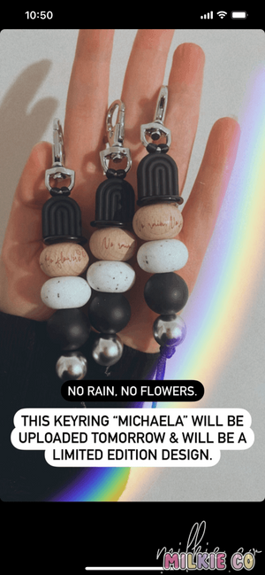 Our ‘Michaela’ keyring features a range of 15-22mm silicone beads on a Silver Swivel Clasp. Engraved on the wooden bead is “No rain, no flowers”