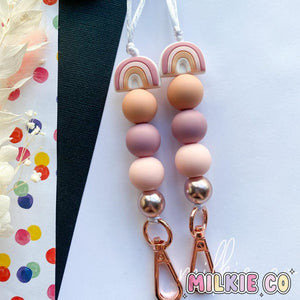 Our 'Nellie’ lanyard features a range of 15mm-19mm silicone and acrylic beads, on a White cord with a Rose Gold 38mm Swivel Clasp,