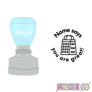 This round 32mm refillable stamp can be personalised by name, ink colour.If you have any preference to stamp shell colour, please leave a note at checkout - otherwise it will come as pictured or as per available stock.